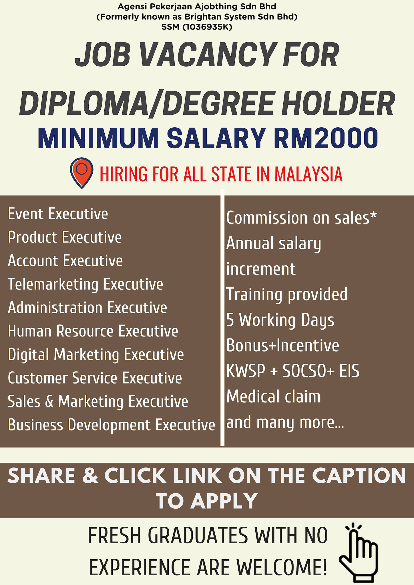 تويتر Maukerja على تويتر Looking For All Fresh Graduate With At Least Diploma Degree Qualification Candidates Without Experience Are Encouraged To Apply As They Will Provide Basic Training Urgent Job Https T Co Hbxab1tjaz Executive
